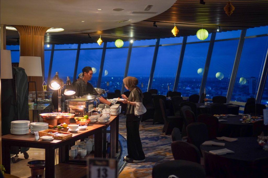 Bagi tamu yang menginginkan pengalaman berbuka puasa yang lebih eksklusif, 360 Degree Function Room di lantai 23 menawarkan kesan elegan dengan kapasitas hingga 150 orang. Ruangan berkonsep lantai berputar ini menghadirkan panorama 360 derajat Kota Surabaya yang memukau, menciptakan momen berbuka yang unik dan berkesan. Sajian khas Timur Tengah seperti kambing guling, serta hidangan penutup autentik seperti baklava dan umm ali, melengkapi pengalaman istimewa ini. Paket berbuka puasa tersedia dengan harga Rp 599.000++ per orang.
